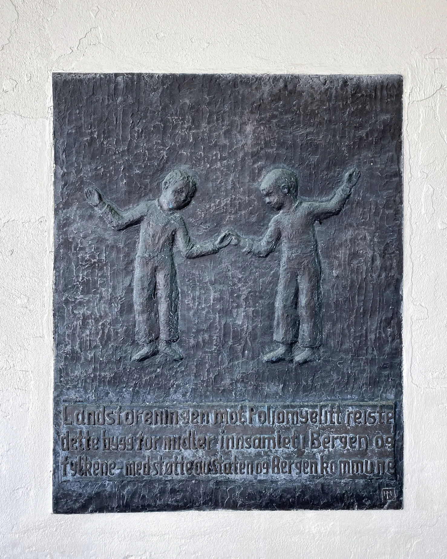 «Minnetavle» heng på veggen ved hovudinngang i Lille parkbygg, tidlegare Poliobygget. Den viser to barn i tillegg til teksten "Landsforeningen mot Poliomyelitt reiste dette bygg for midler innsamlet i Bergen og fylkene - med støtte av Staten og Bergen Kommune".