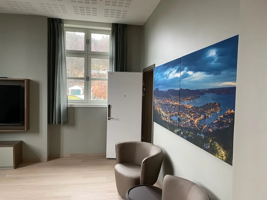 Lukta av nytt møter oss idet vi går inn i dei ombygde lokala. Veggane er måla i lyse, roande fargar, pryda med bilete av natur og kjende stader frå Bergen. Dei breie korridorane gir ei open og luftig kjensle. Ingen stolar står aleine – alt er lagt til rette for samarbeid og samtalar.