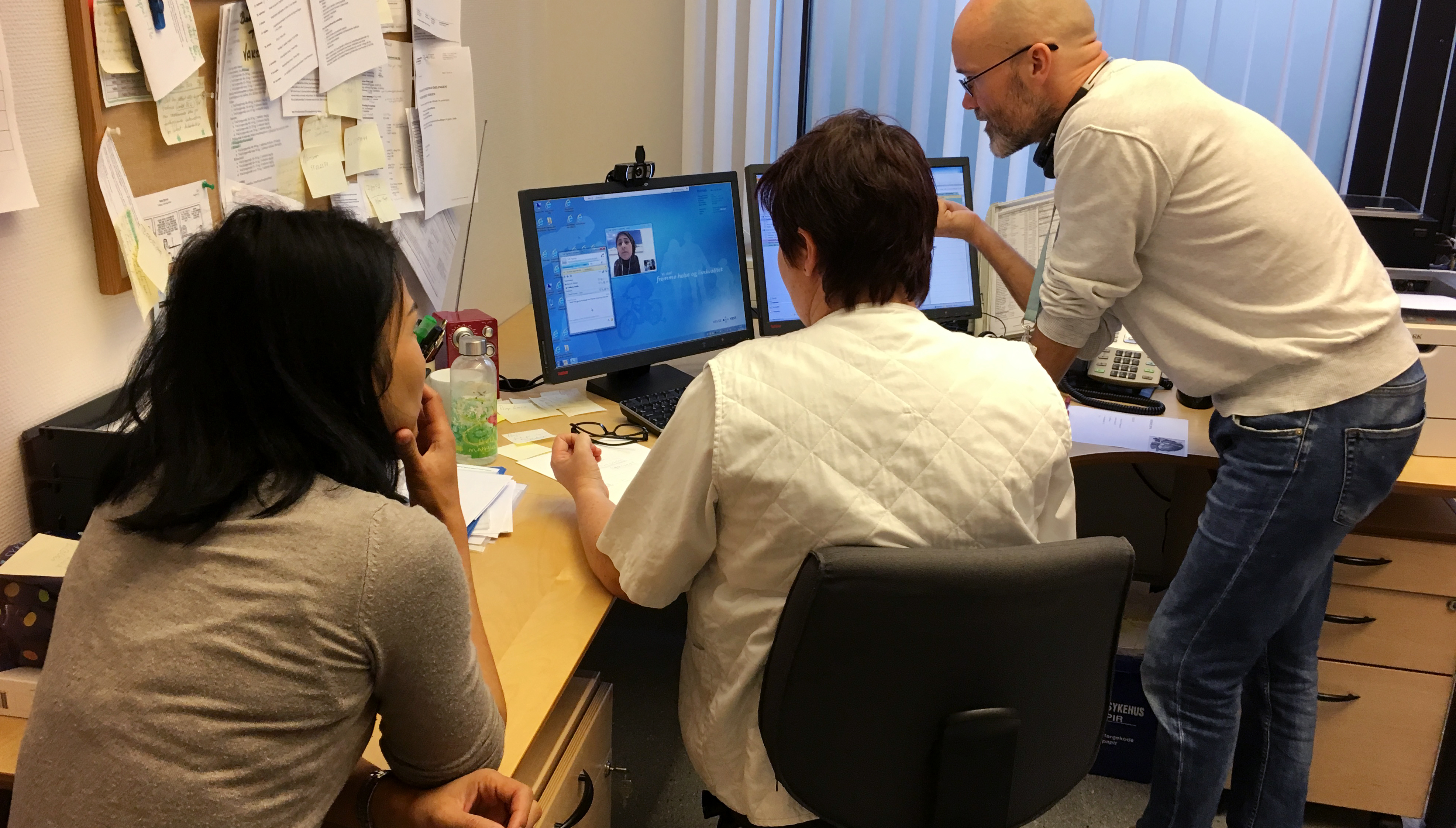 Panita Laksuktom, Rut Hanstveit og Robert Bjørsvik i samtale med Duah Hussein fra TolkeNett. De tror skjermtolking vil bedre kommunikasjonen betraktelig både for tolker og pasient.